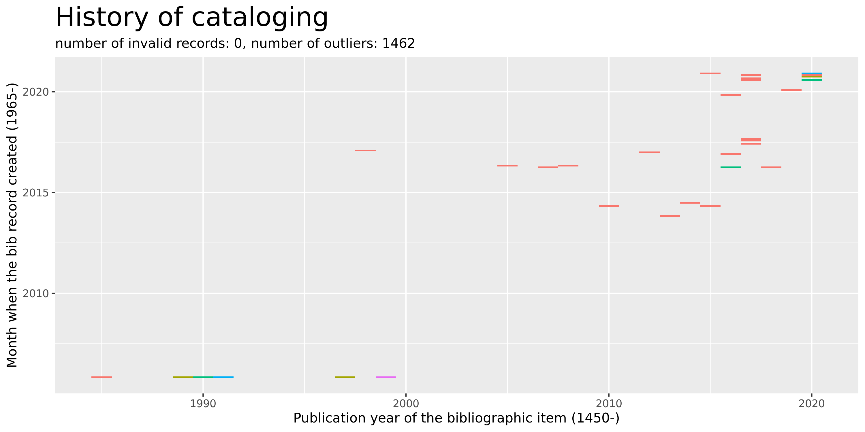 The Y axis is based on the "date entered on file" data element that indicates the date the MARC record was created (008/00-05), the X axis is based on "Date 1" element (008/07-10).