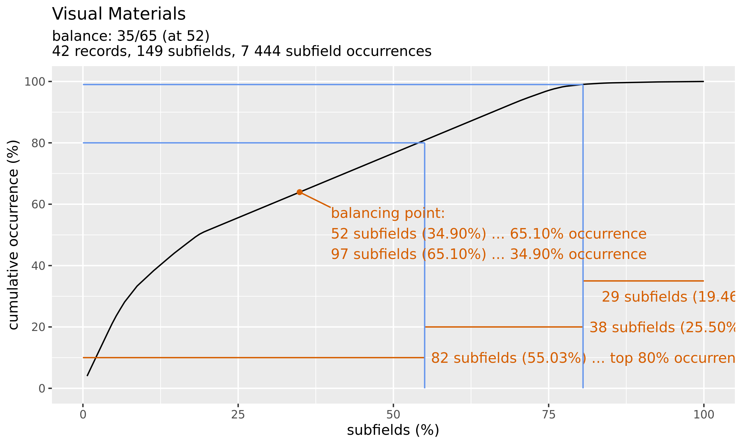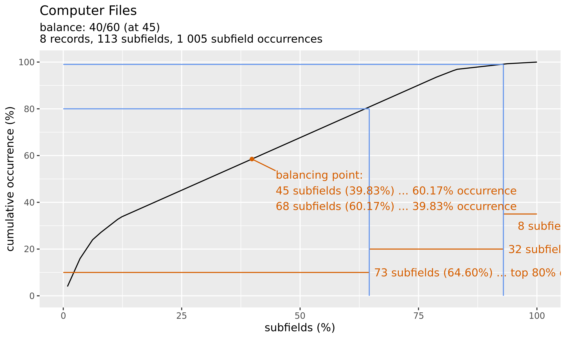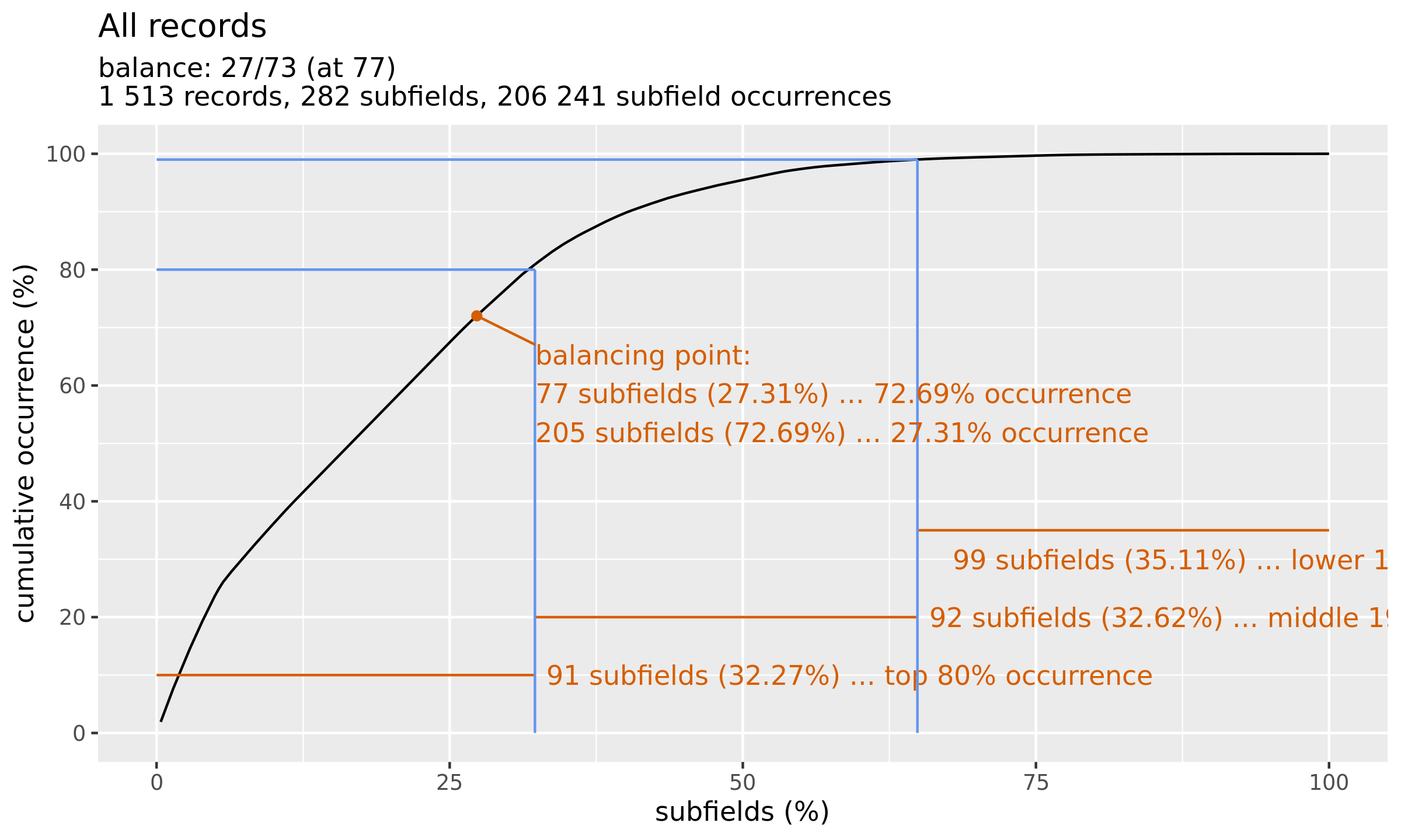 These charts show how the field frequency patterns. Each chart shows a line which is the function of field frequency: on the x axis you can see the subfields ordered by the frequency (how many time a given subfield occured in the whole catalogue). They are ordered by frequency from the most frequent top 1% to the least frequent 1% subfields. The Y axis represents the cumulative occurrence (from 0% to 100%).